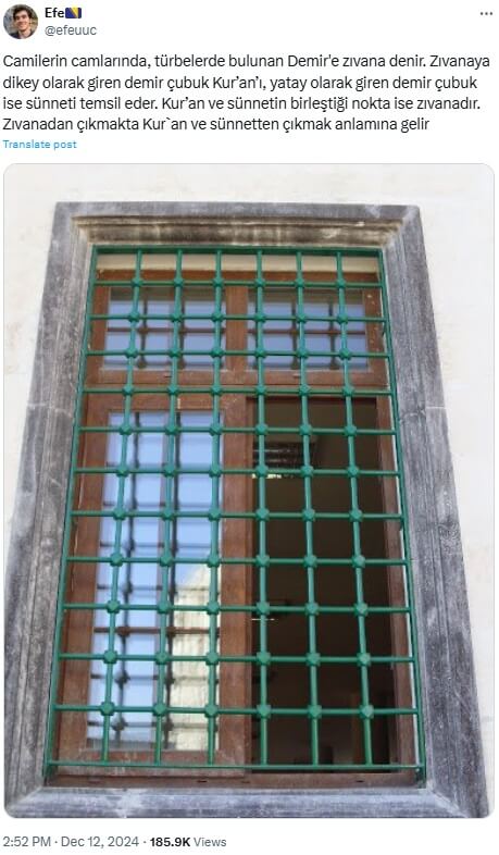 Efe (@efeuuc): “Camilerin camlarında, türbelerde bulunan Demir’e zıvana denir. Zıvanaya dikey olarak giren demir çubuk Kur’an’ı, yatay olarak giren demir çubuk ise sünneti temsil eder. Kur’an ve sünnetin birleştiği nokta ise zıvanadır. Zıvanadan çıkmakta Kur`an ve sünnetten çıkmak anlamına gelir”