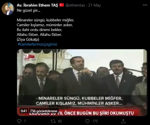 “Bu nedenledir ki, çıkış yapmakta Tayyip Erdoğan Ziya Gökalp’in 1912 yılında yazdığı şiirin son kıt’asını okuduğu için 10 ay hapse mahkum oldu.”