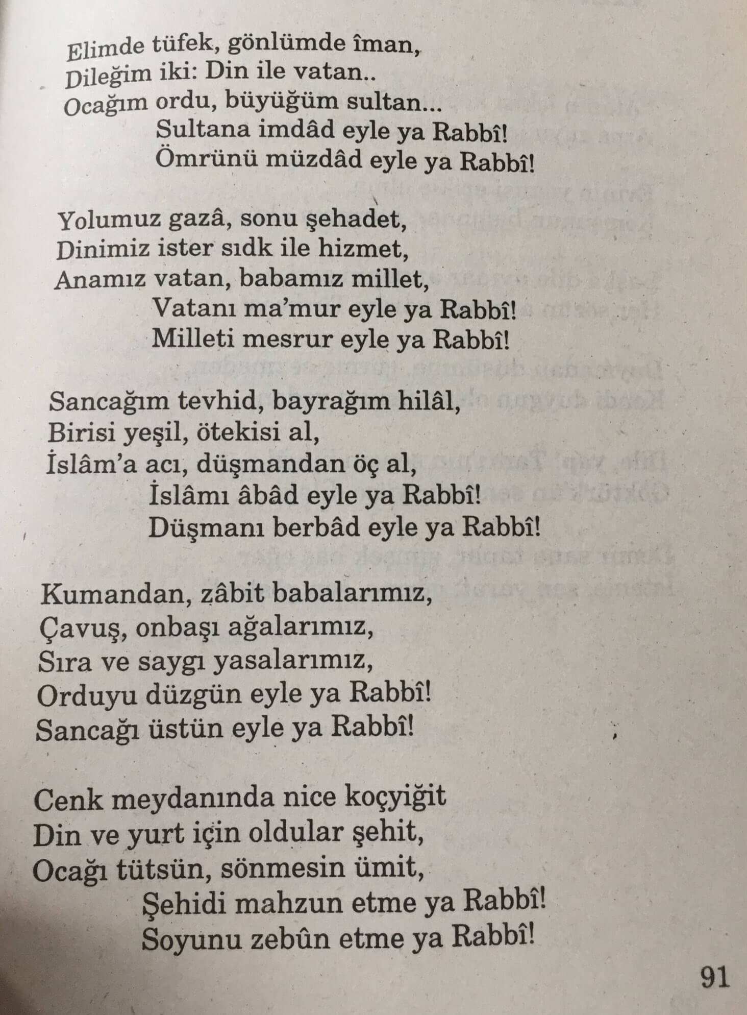 (Ziya Gökalp’in Asker Duası isimli şiirindeki “Kumandan, zabit, babalarımız / Çavuş, onbaşı, ağalarımız / Sıra ve saygı, yasalarımız / Orduyu düzgün eyle Yarabbi! / Sancağı üstün eyle Yarabbi!” dizelerine yer verilmeden) iki şiirin birleştirilerek paylaşılan versiyonu şöyleydi:
